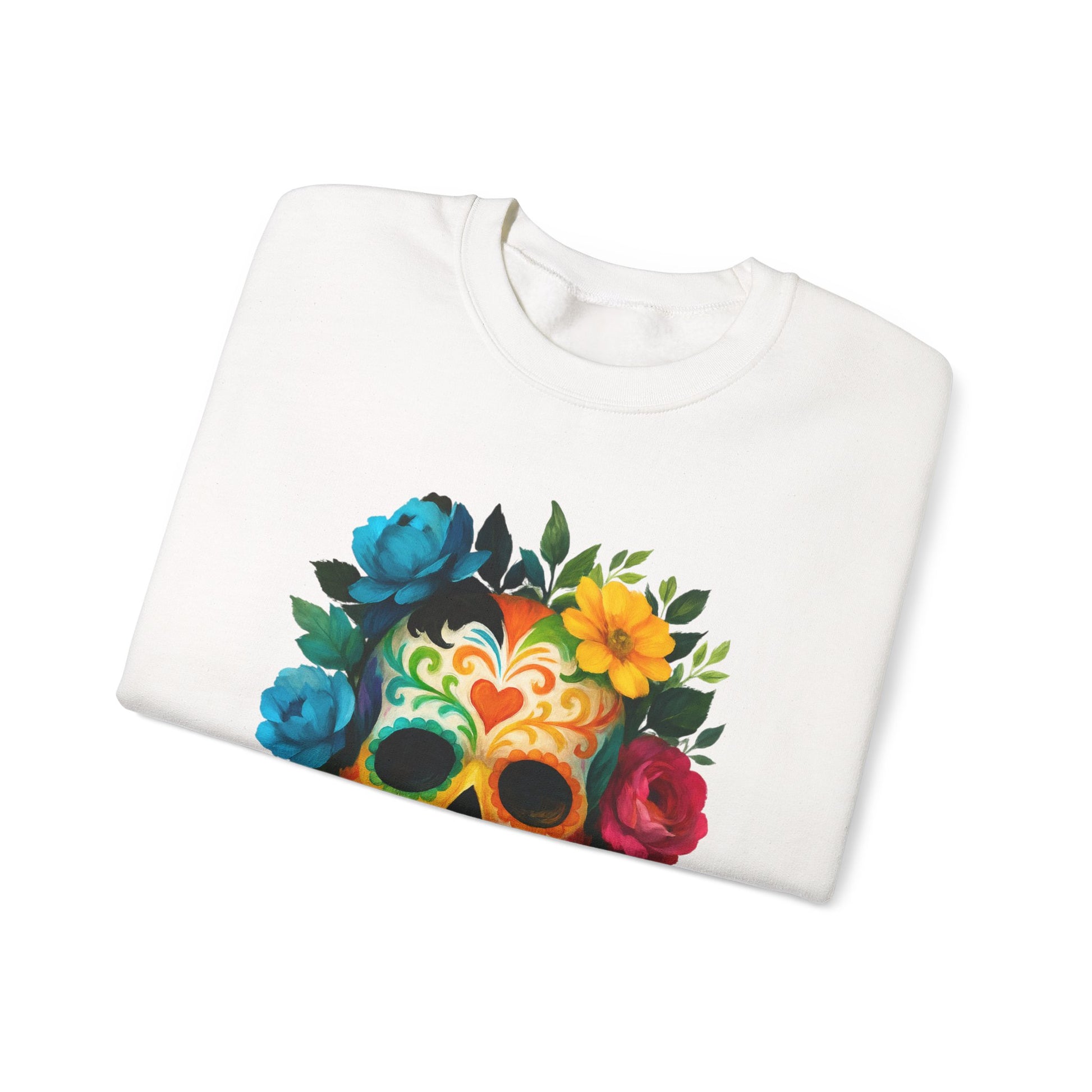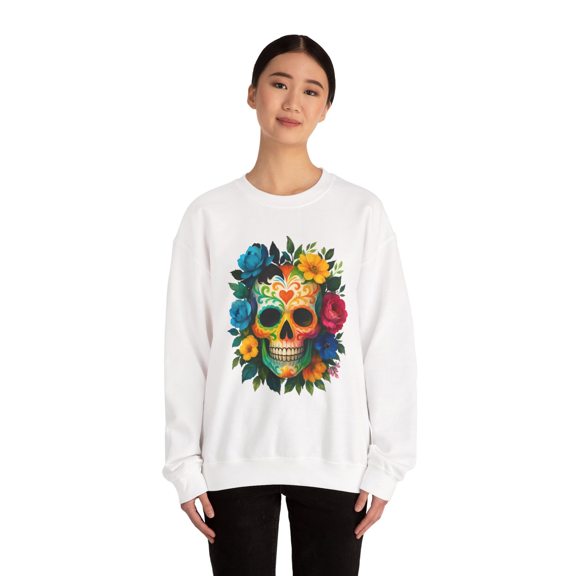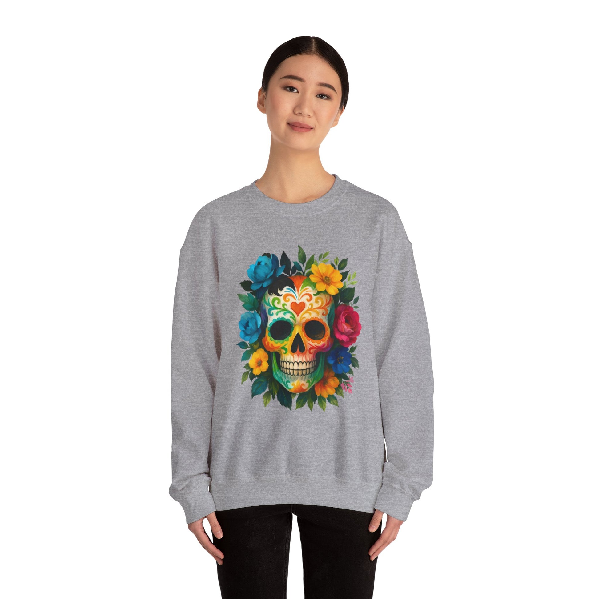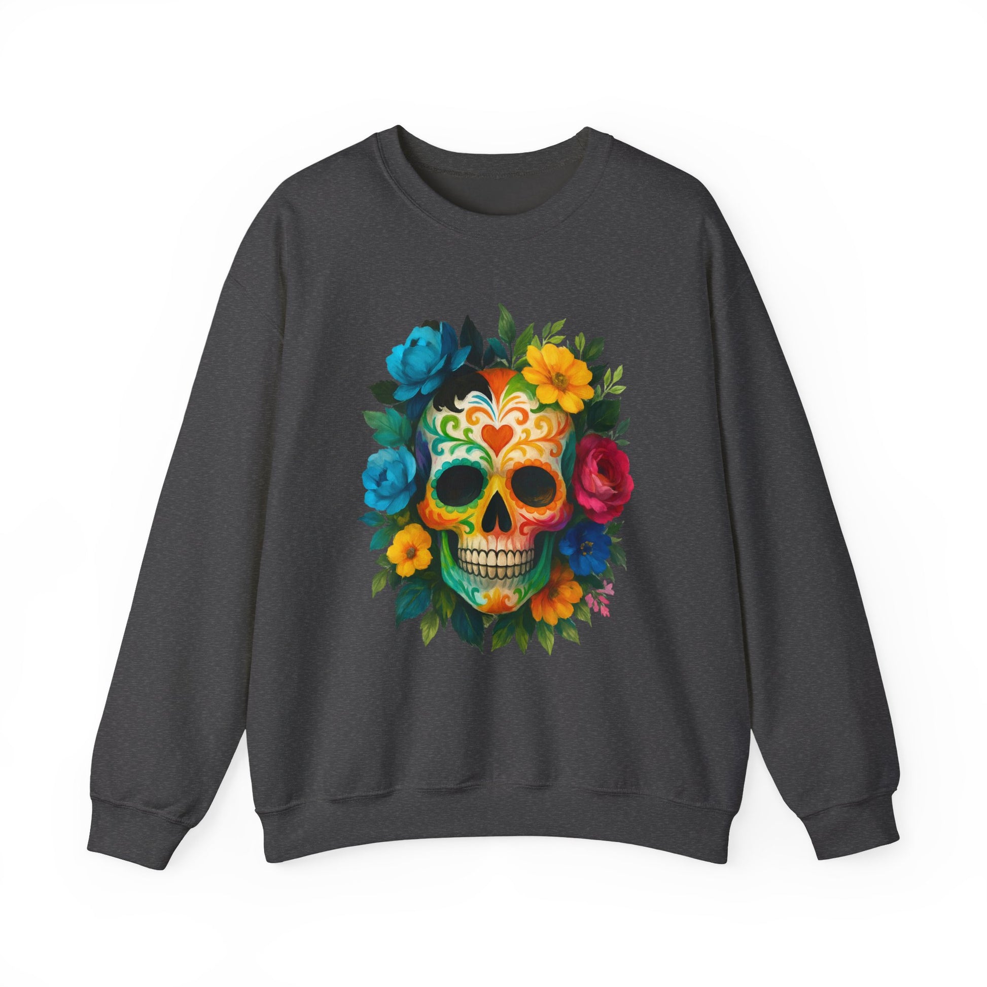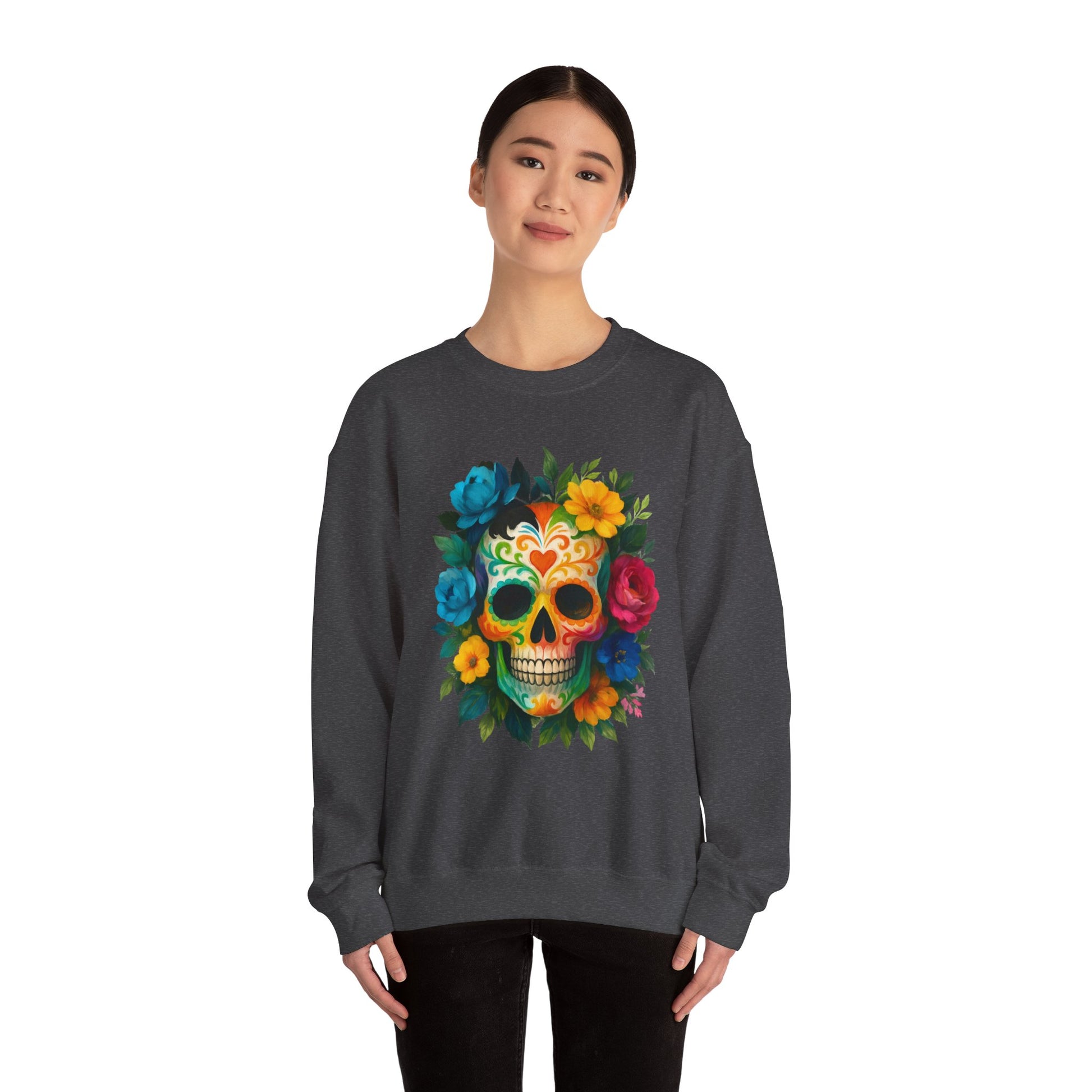 Embrace comfort and style with this Unisex Heavy Blend™ Crewneck Sweatshirt, perfect for casual outings or cozy nights in. The vibrant design, featuring a colorful skull surrounded by blooming flowers, radiates a festive and artistic atmosphere. This sweatshirt is a great addition to your wardrobe, suitable for all seasons and versatile enough for layering. Ideal for art lovers, those who appreciate unique styles, or anyone looking to celebrate life’s colorful moments. Perfect for occasions like Día de los Muertos, birthdays, or everyday casual wear, this sweatshirt brings flair to any outfit while also making a thoughtful gift for loved ones.