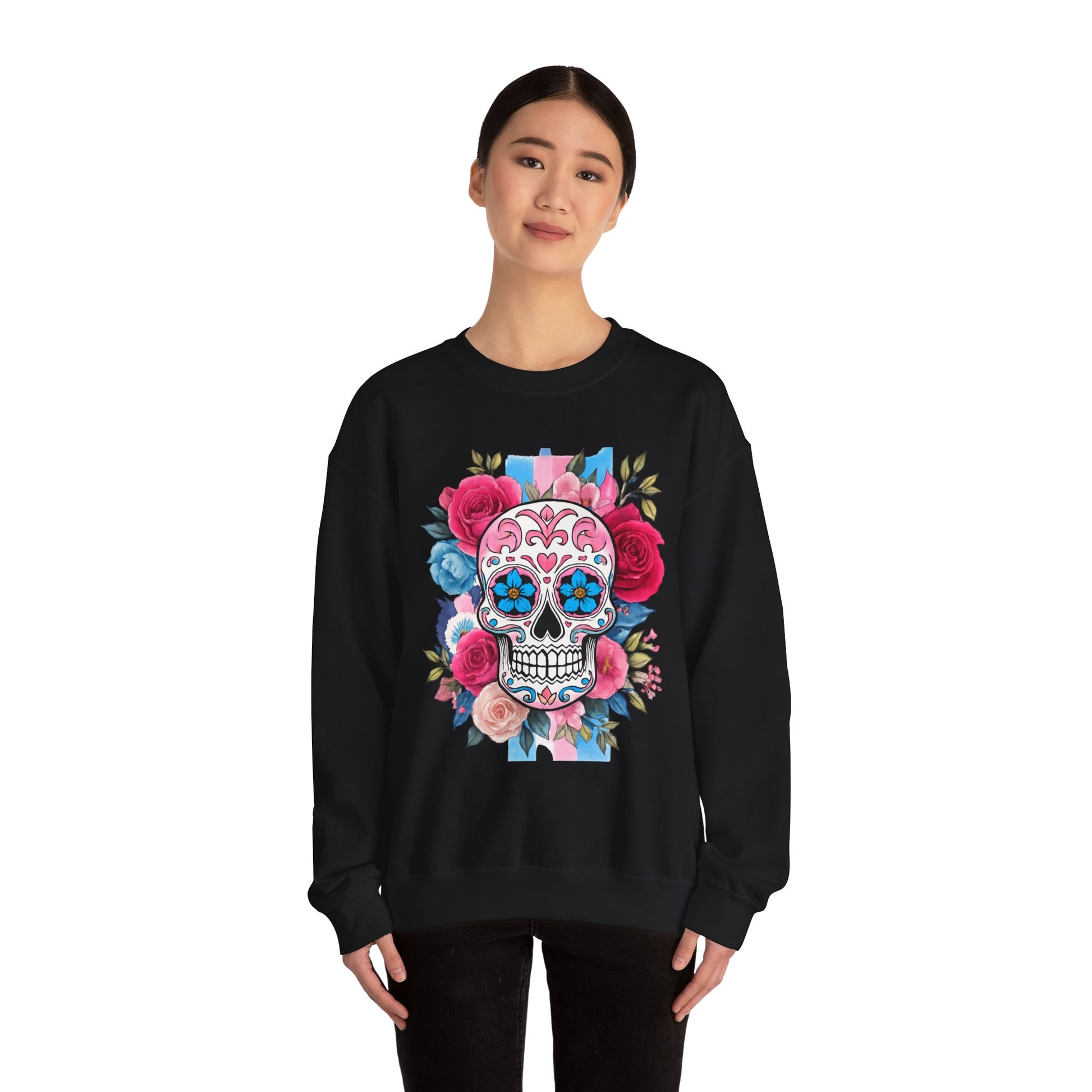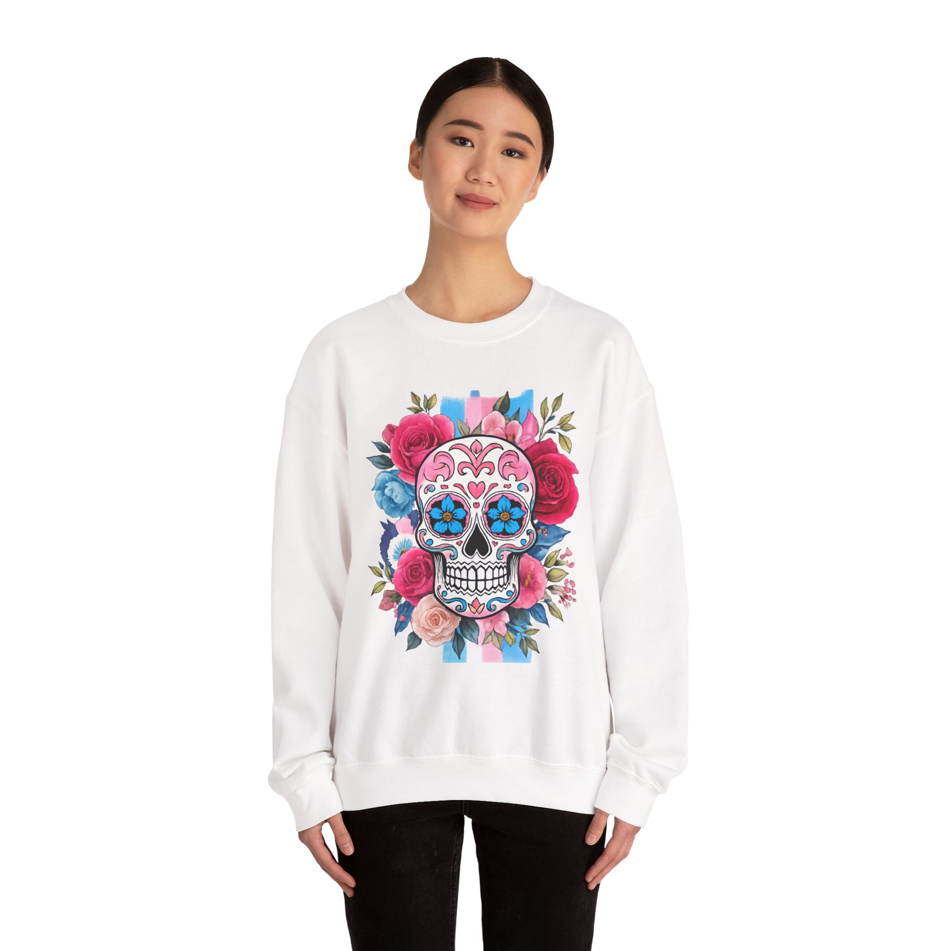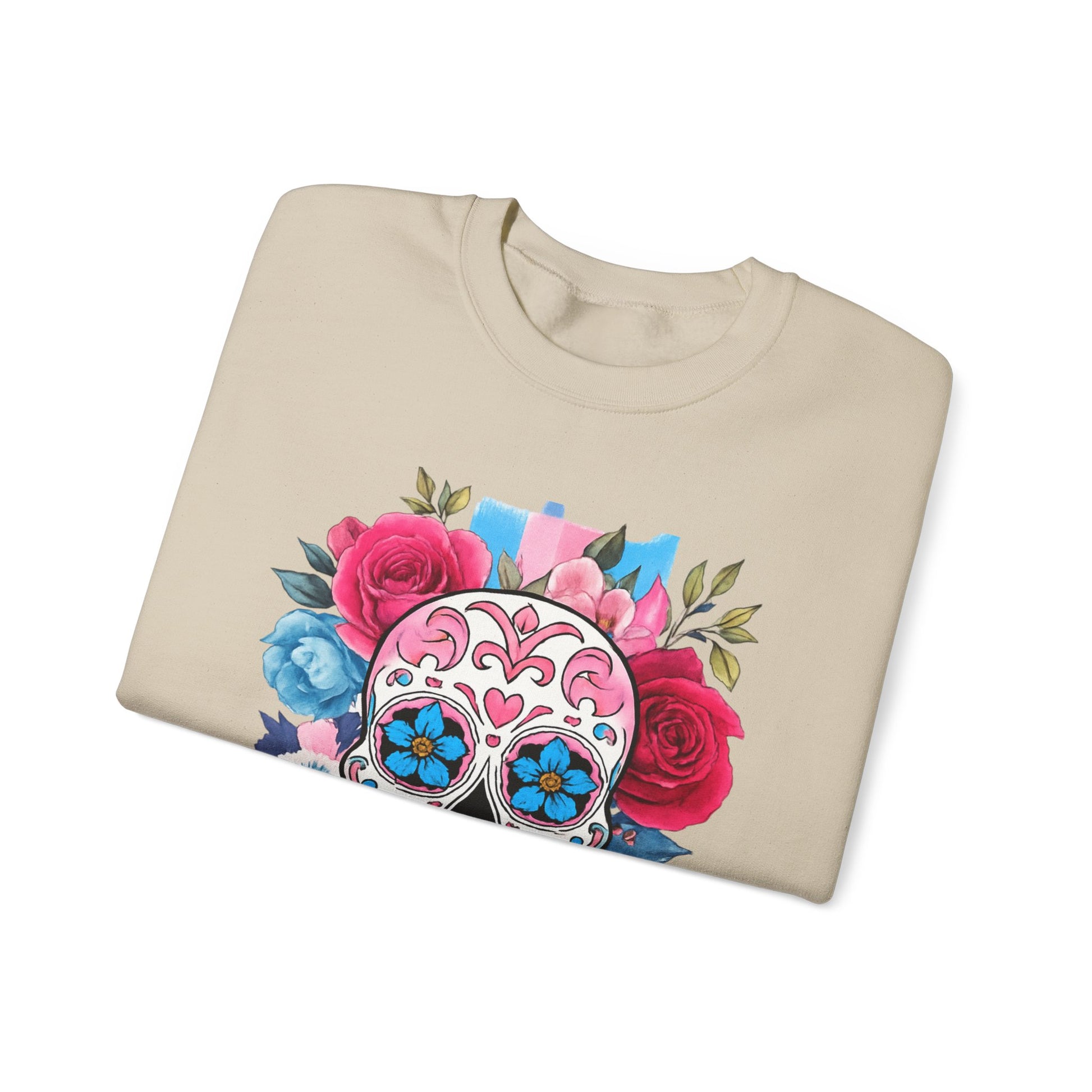 olorful skull surrounded by blooming flowers, radiates a festive and artistic atmosphere. This sweatshirt is a great addition to your wardrobe, suitable for all seasons and versatile enough for layering. Ideal for art lovers, those who appreciate unique styles, or anyone looking to celebrate life’s colorful moments. Perfect for occasions like Día de los Muertos, birthdays, or everyday casual wear, this sweatshirt brings flair to any outfit while also making a thoughtful gift for loved ones.