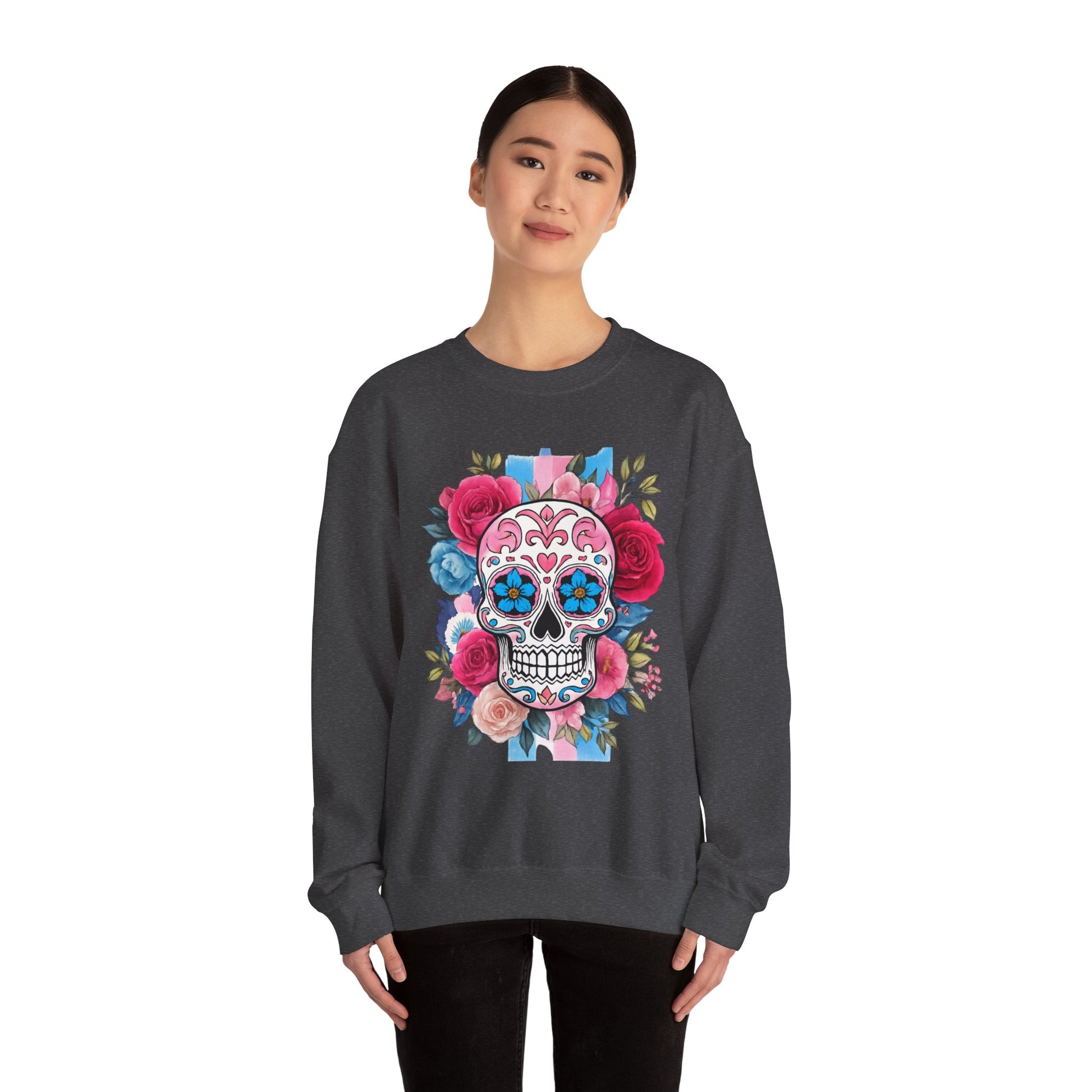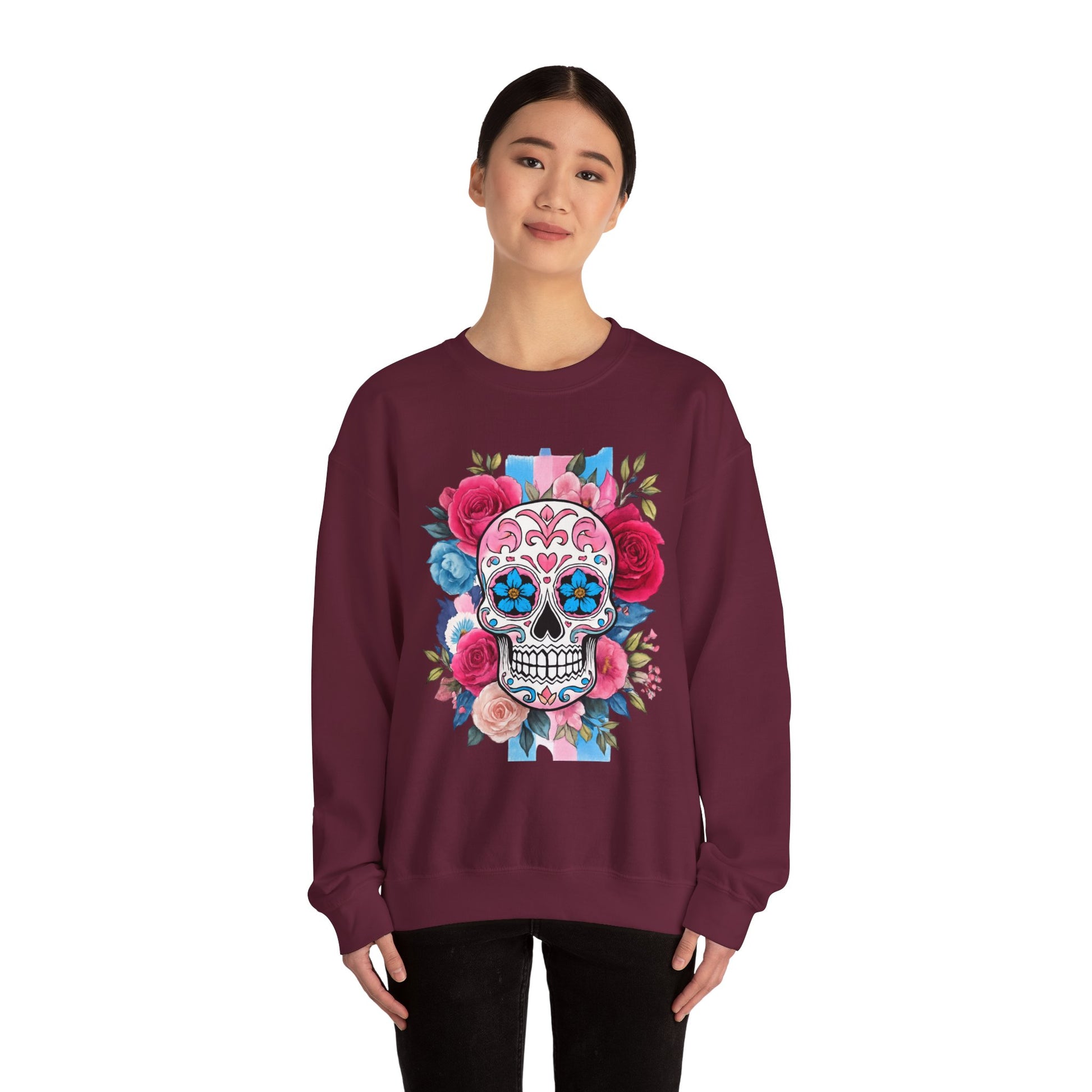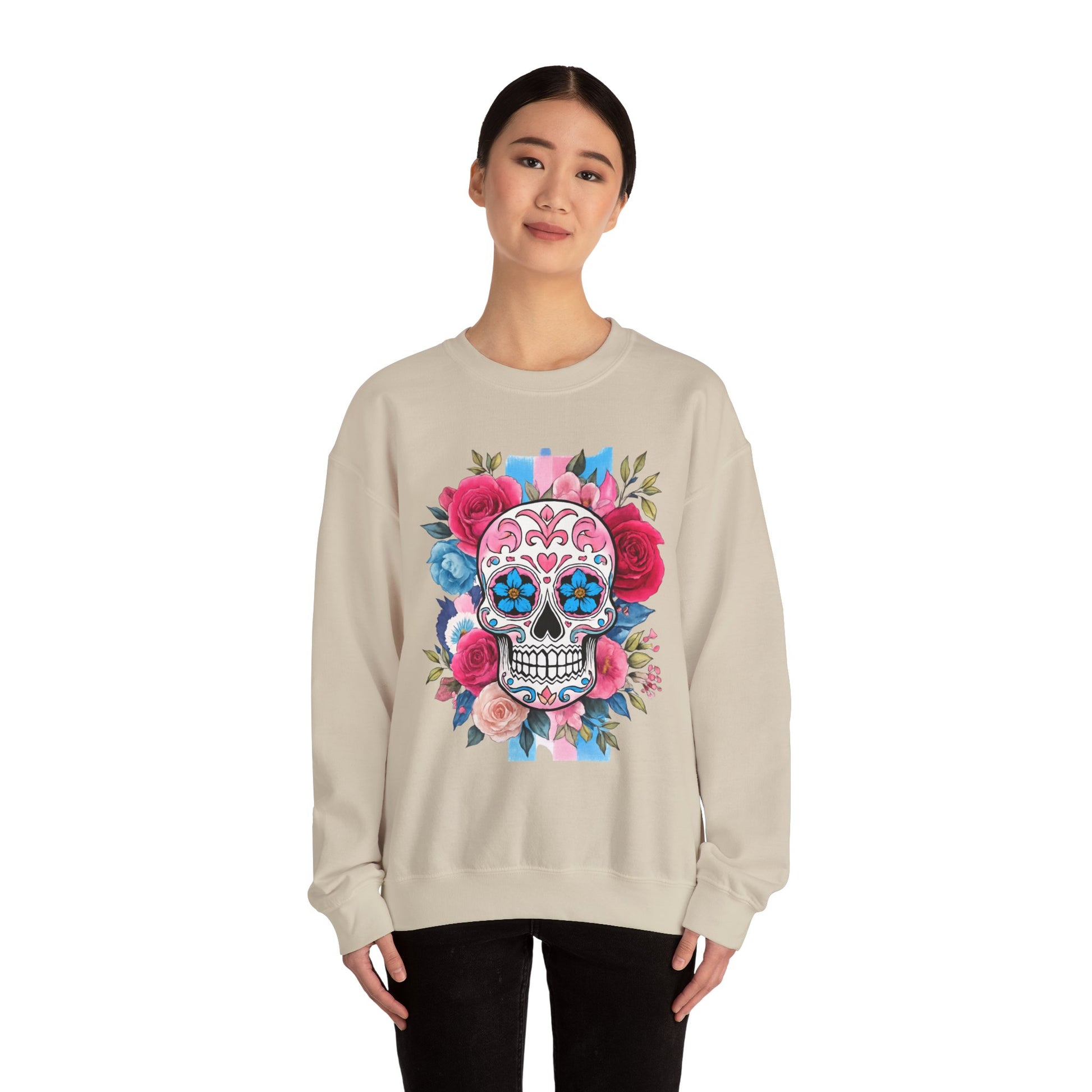 olorful skull surrounded by blooming flowers, radiates a festive and artistic atmosphere. This sweatshirt is a great addition to your wardrobe, suitable for all seasons and versatile enough for layering. Ideal for art lovers, those who appreciate unique styles, or anyone looking to celebrate life’s colorful moments. Perfect for occasions like Día de los Muertos, birthdays, or everyday casual wear, this sweatshirt brings flair to any outfit while also making a thoughtful gift for loved ones.