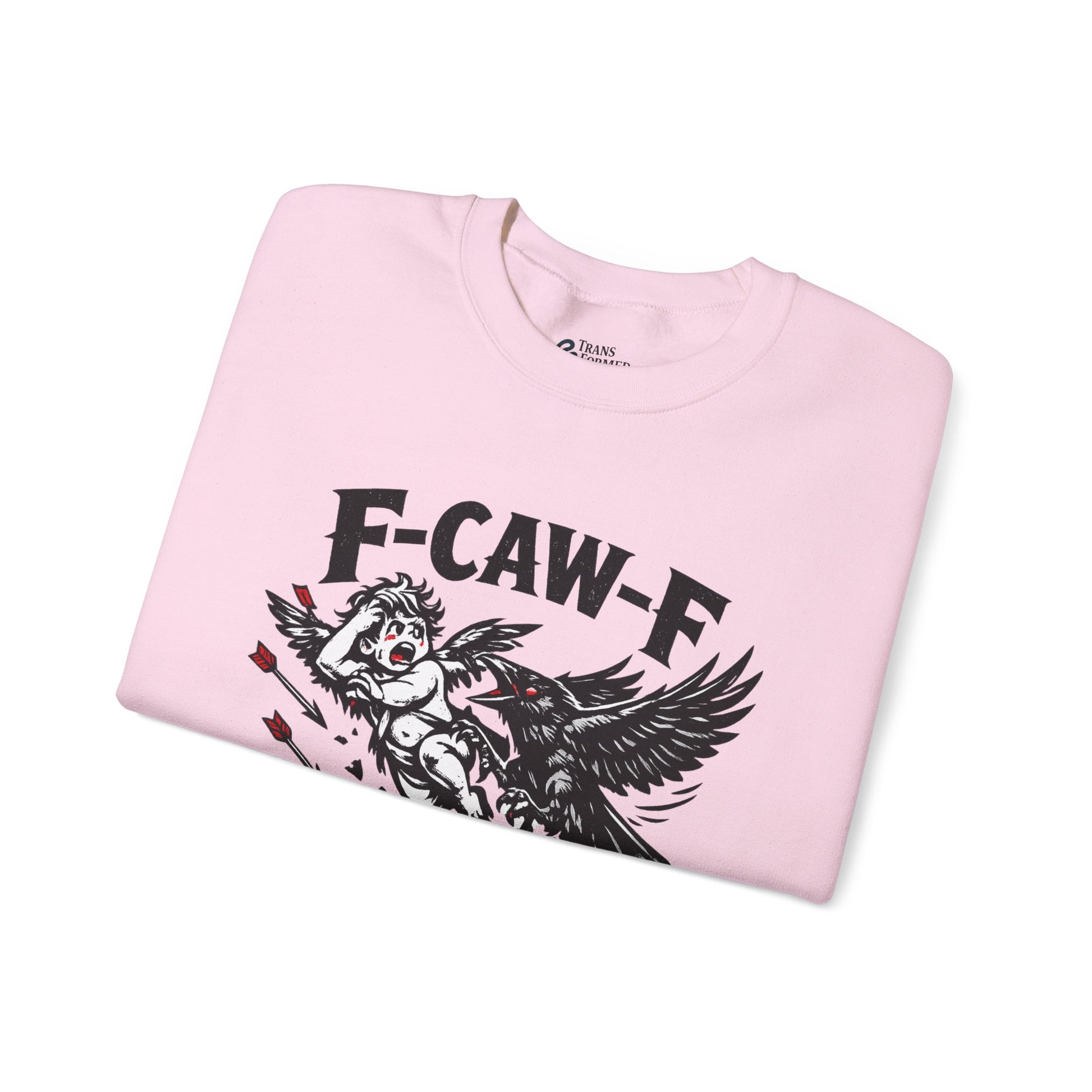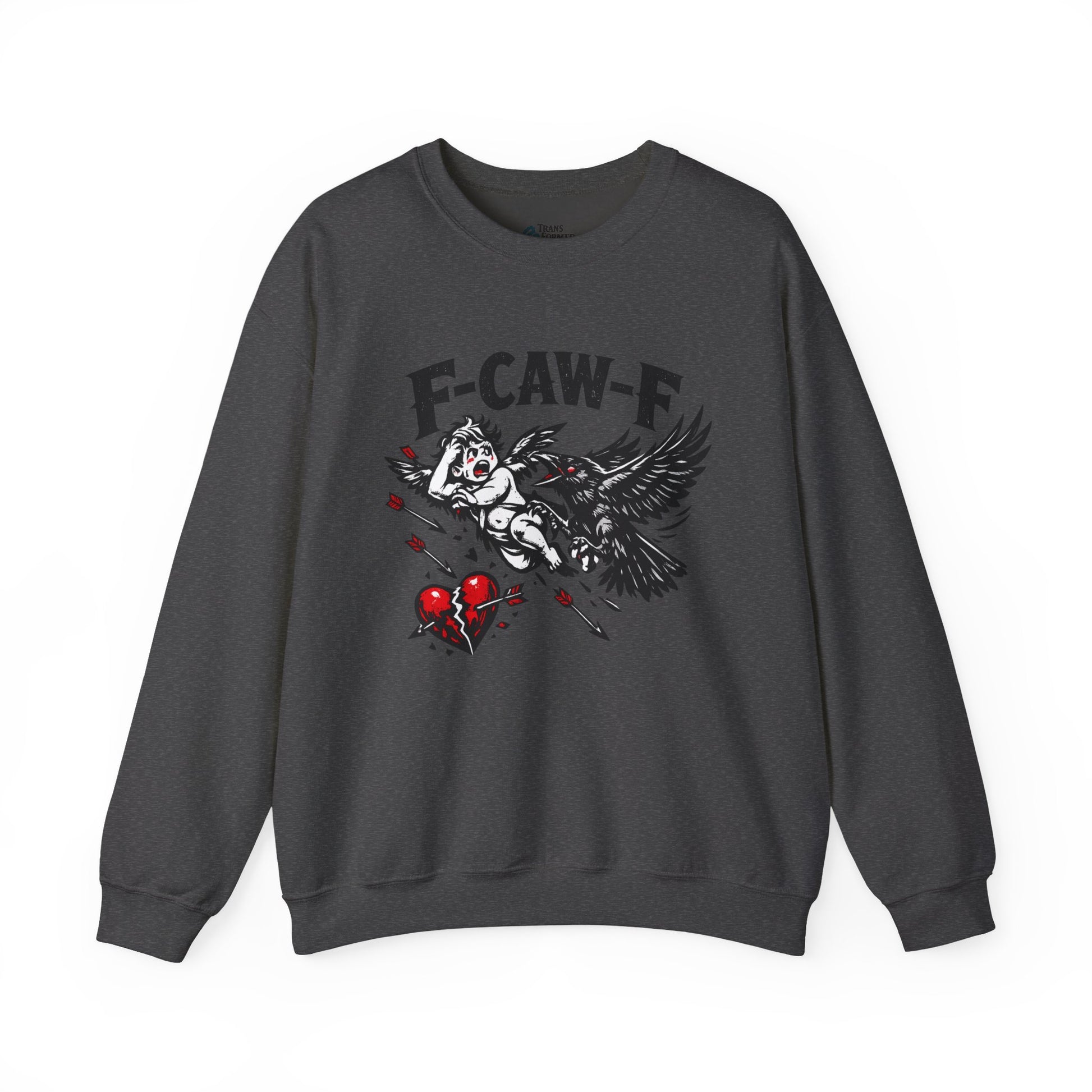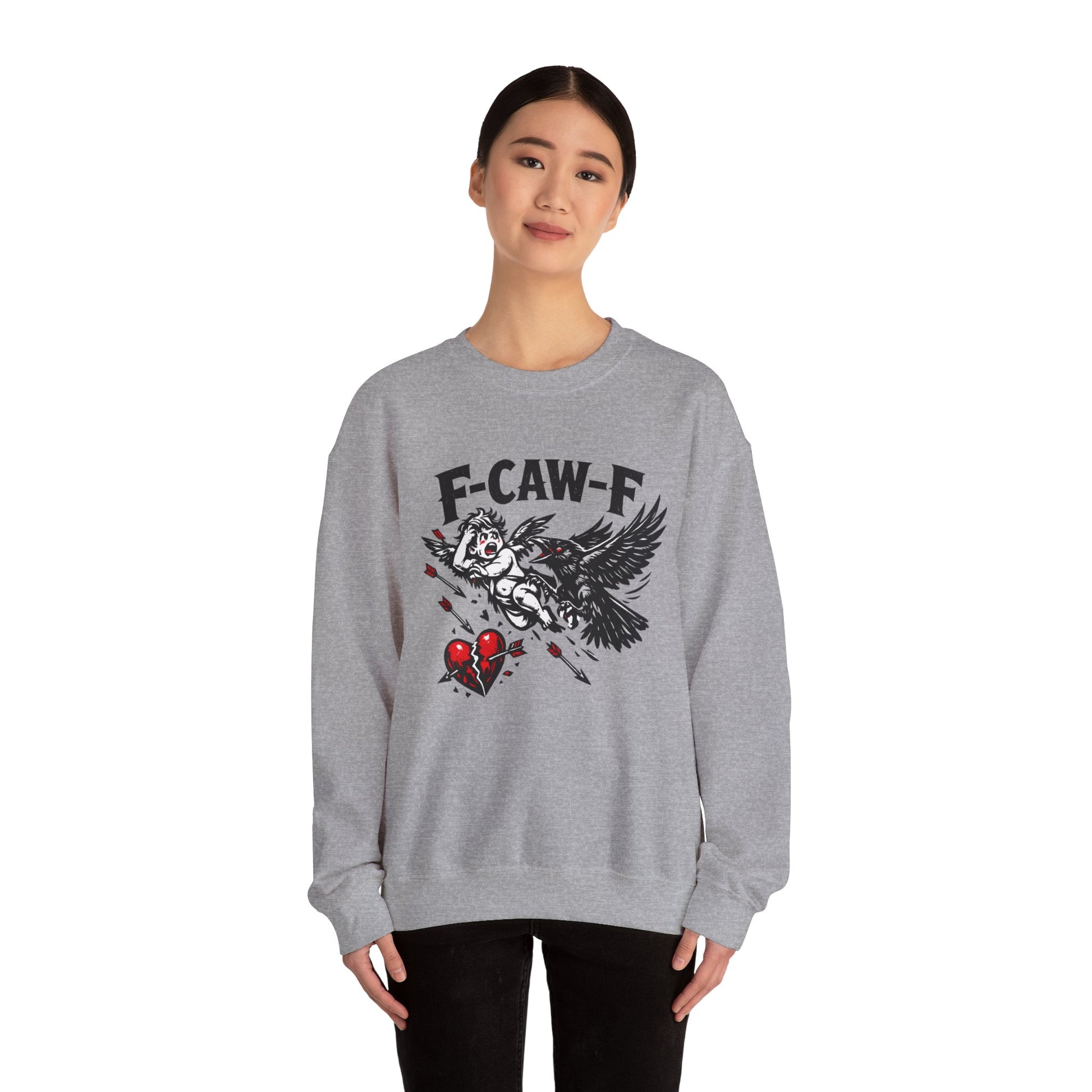 Comfortable, cozy, and unapologetically anti-Valentine — this classic crewneck sweatshirt features the bold F-CAW-F crow-versus-Cupid graphic for anyone opting out of forced romance and Hallmark expectations.